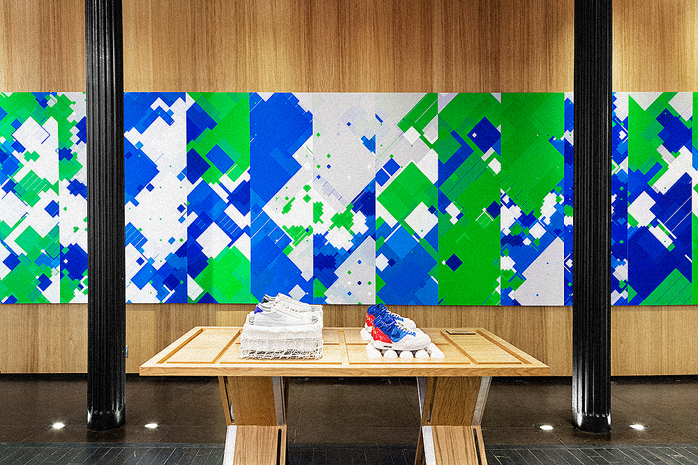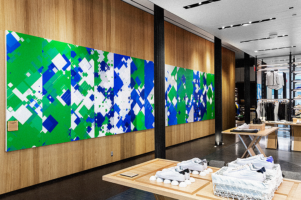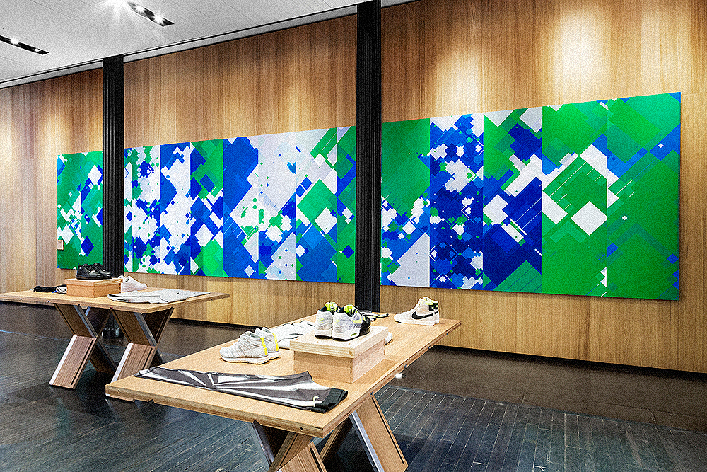 The final sketch takes these forms and colors and assigns them across an audio spectrum... so that certain colors and textures are graphic representations of sounds that happen in a court match. Everything from the sound of the ball volleys, the groans and grunts, the explosive crowd cheers, and announcers commentary. wearesubrosa then took these elements to produce a 6.5 x 30 foot mural for the south facing wall in the NikeLab 21 Mercer Soho Store. 15 printed wood "digital camouflage" panels in total, every 3 panels an audio composition from a specific USOpen Nike Athlete.
