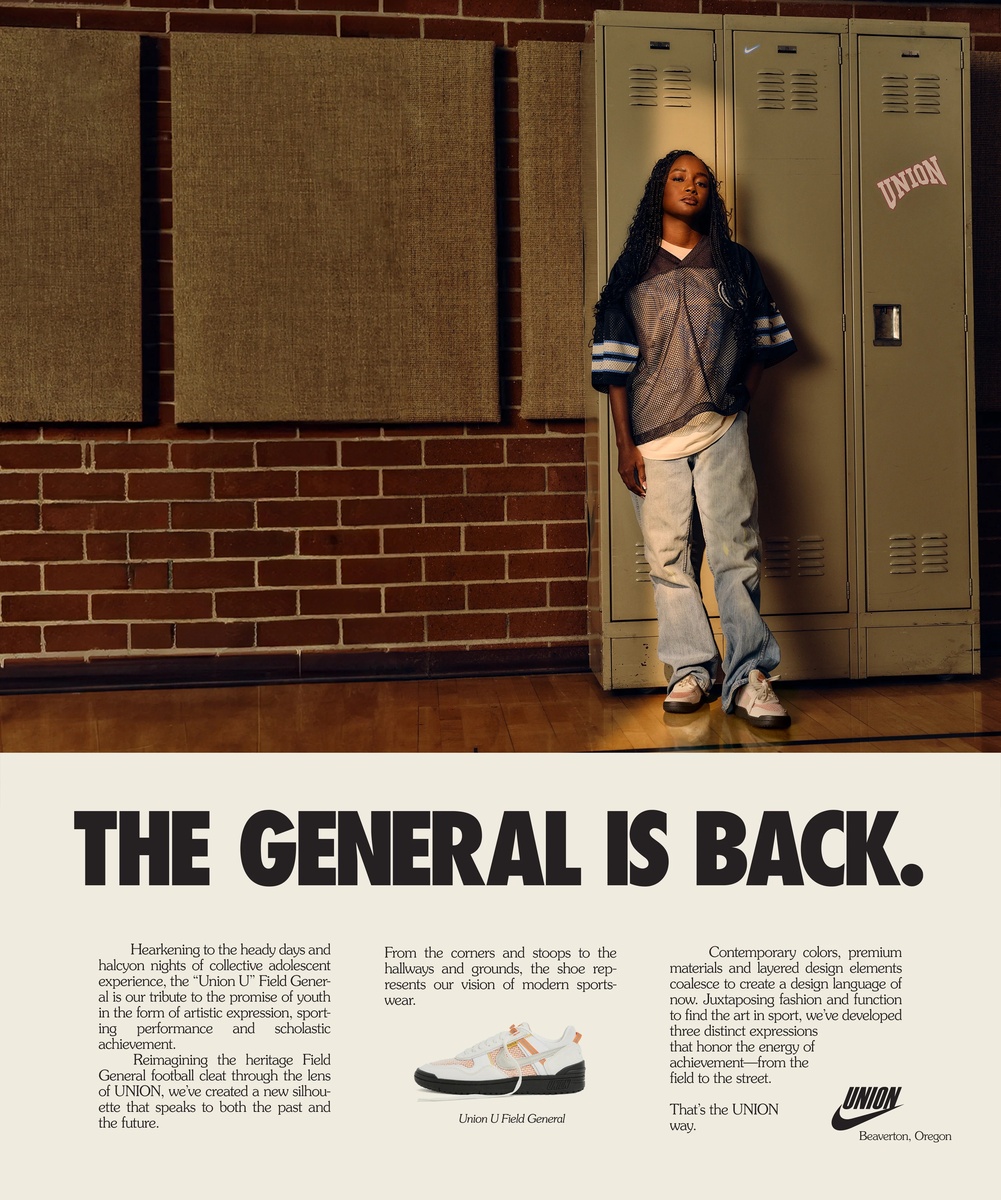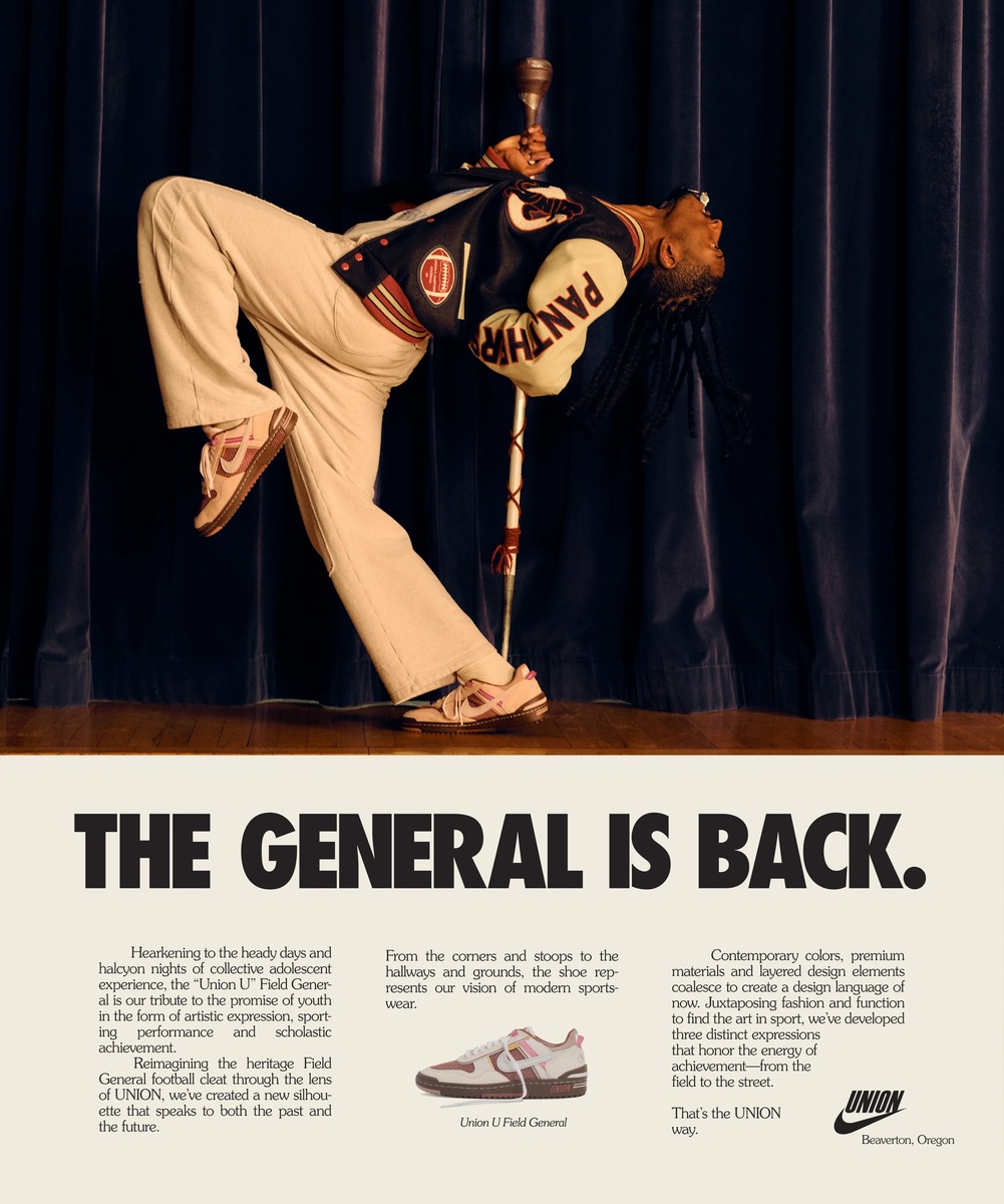Inspired by collective experience and memories of days in high school, college and university, the UNION x Nike “UNION U” field general creates a bridge between art, sport, fashion and performance. Channeling the pageantry and energy of all things youthful and scholastic, the design of the shoe seeks to reimagine and reinvent the 1982 field general football cleat as a modernized sportswear silhouette for the streets and hallways of today.