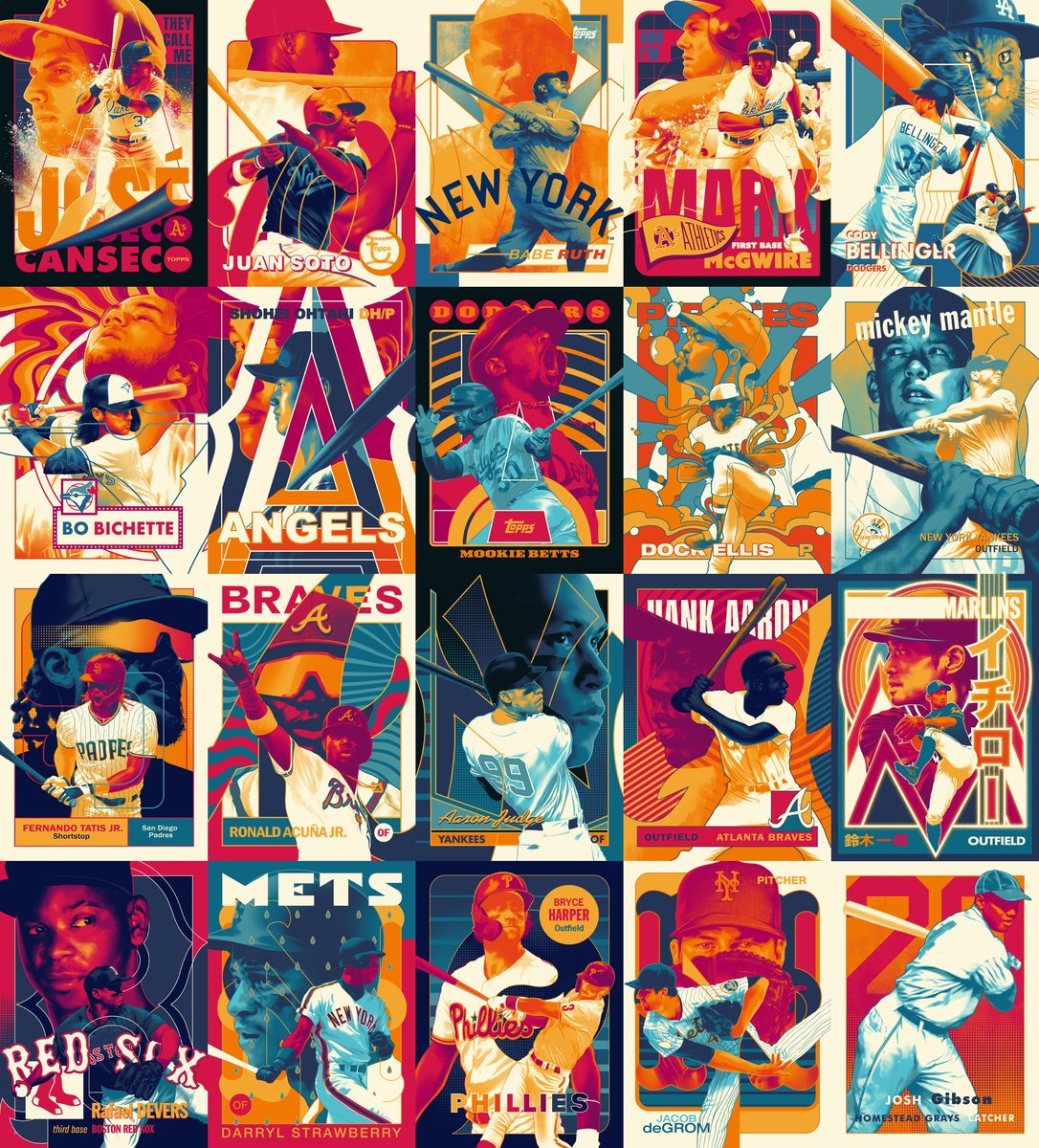 Matt Taylor partners with Topps to re-imagine 70 years of iconic baseball card designs for Topps’ Project70. Matt’s bold compositions with bright blues, reds, and oranges capture the excitement of watching these master players in kinetic action! New cards launch daily on Topps.com and are only available for 70 hours.