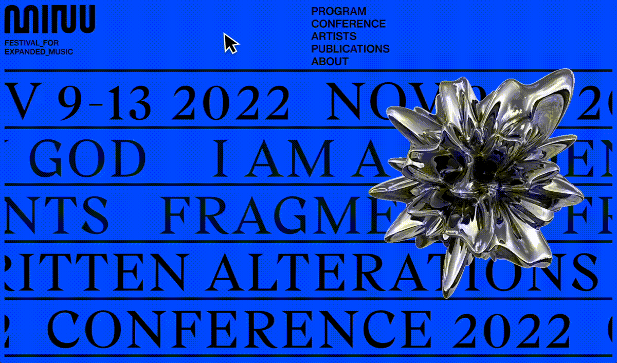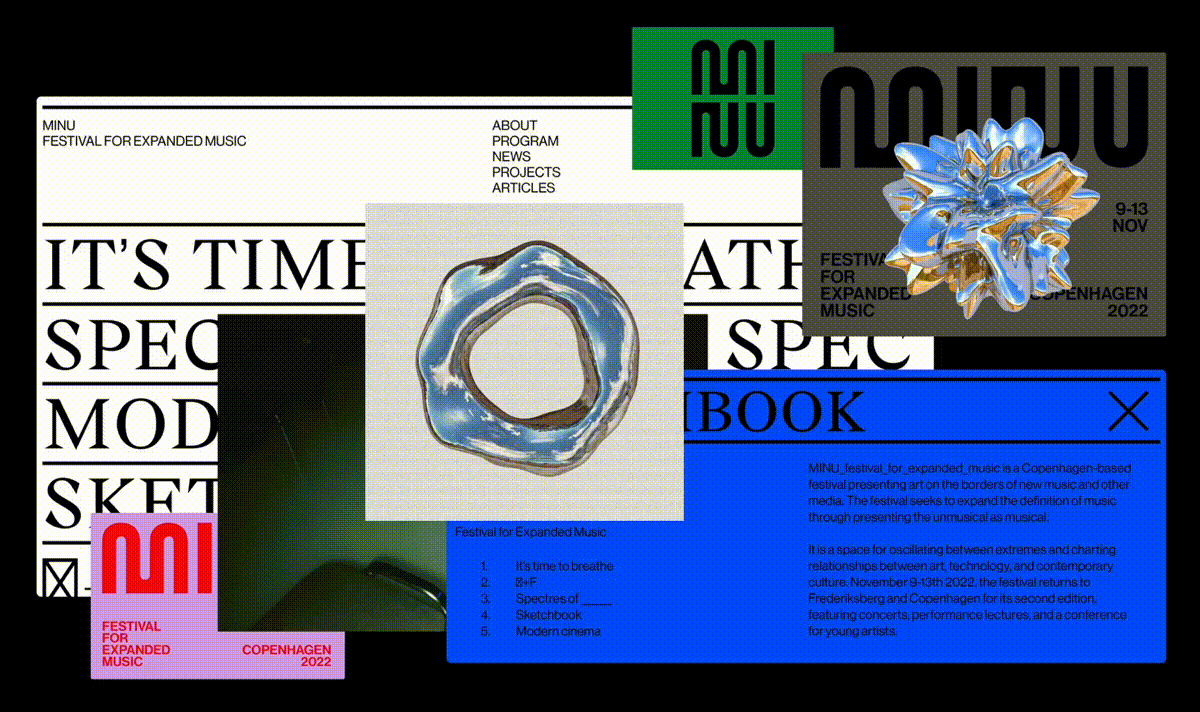 In crafting MINU festival's branding, graphic design, and web customization, Tina Touli's primary focus was to encapsulate their unique festival ethos. The logo features a custom typography inspired by the rhythmic patterns of sound waves, capturing the essence of the festival's sonic experience. To evoke a sense of raw energy and immersion, abstract 3D shapes were meticulously crafted to convey a captivating "distorted" aesthetic, representing the visceral reaction elicited by sound.